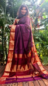 Pure kanchipuram Silk Saree.We always purchase from direct weivers. So its pure and handloom saree.Handloom and powerloom sarees makes great difference.handloom sarees made by weiver in two or more days but powerloom sarees made on machine in one or two hour.but those ladies wear handloom saree she feels great pleasure. So craze of handloom is always.